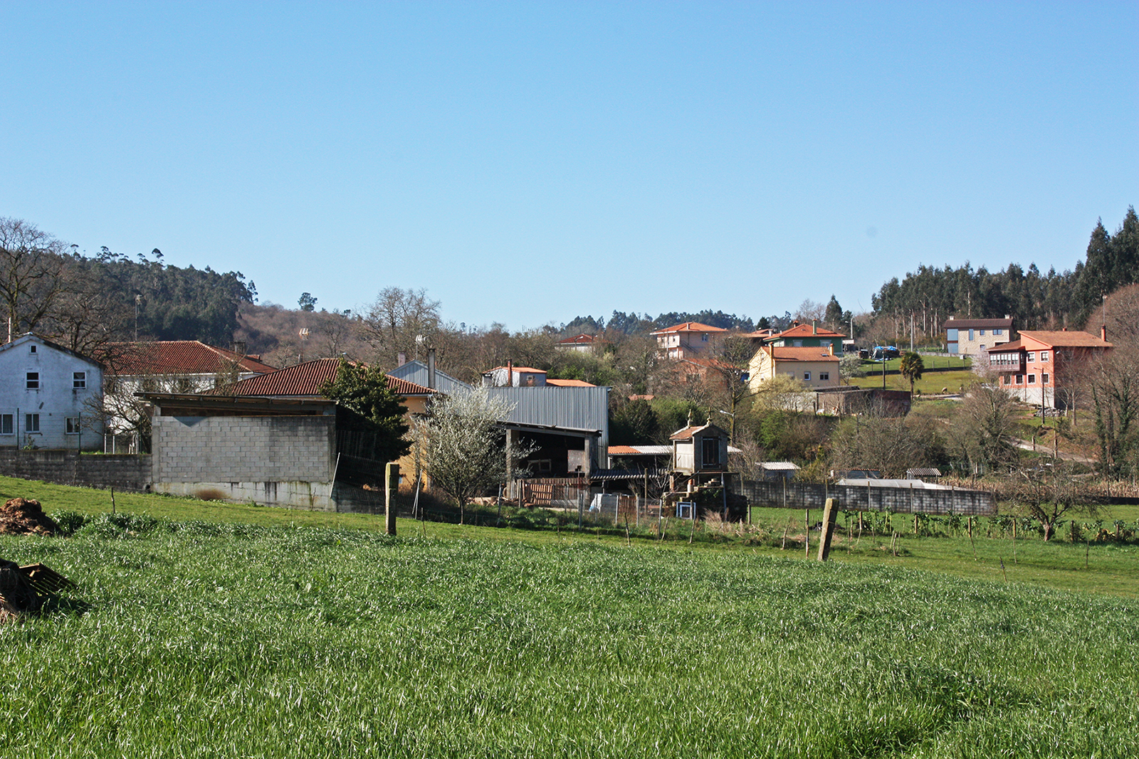 La población reúne un pequeño grupo de casas de labradores con sus establos, alpendres y cobertizos anexos, que están levantadas con madera y piedra de procedencia local; las cubiertas son de teja.