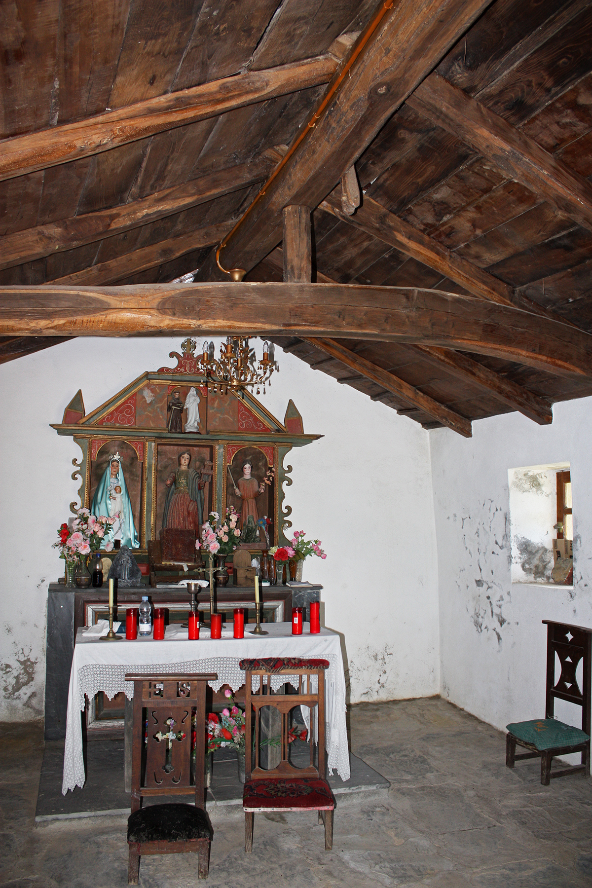 En el interior encontramos un retablo de factura contemporánea, de gusto popular y reminiscencias historicistas. Se trata de una estructura de un piso con tres calles y un ático que remata en forma poligonal, flanqueado en los extremos por una suerte de pináculos. En el espacio central están situadas dos pequeñas figuras correspondientes a San Antonio y la Virgen María. En las peanas dispuestas en el primer piso se encuentran la imagen de Santa Bárbara en el espacio central, el Arcángel San Miguel a su izquierda y, en el lado contrario, la Virgen con el Niño en brazos.