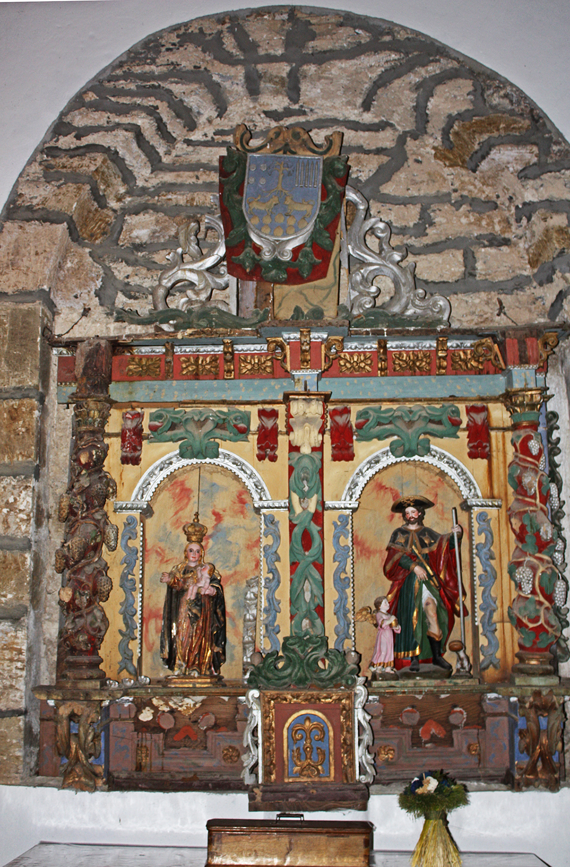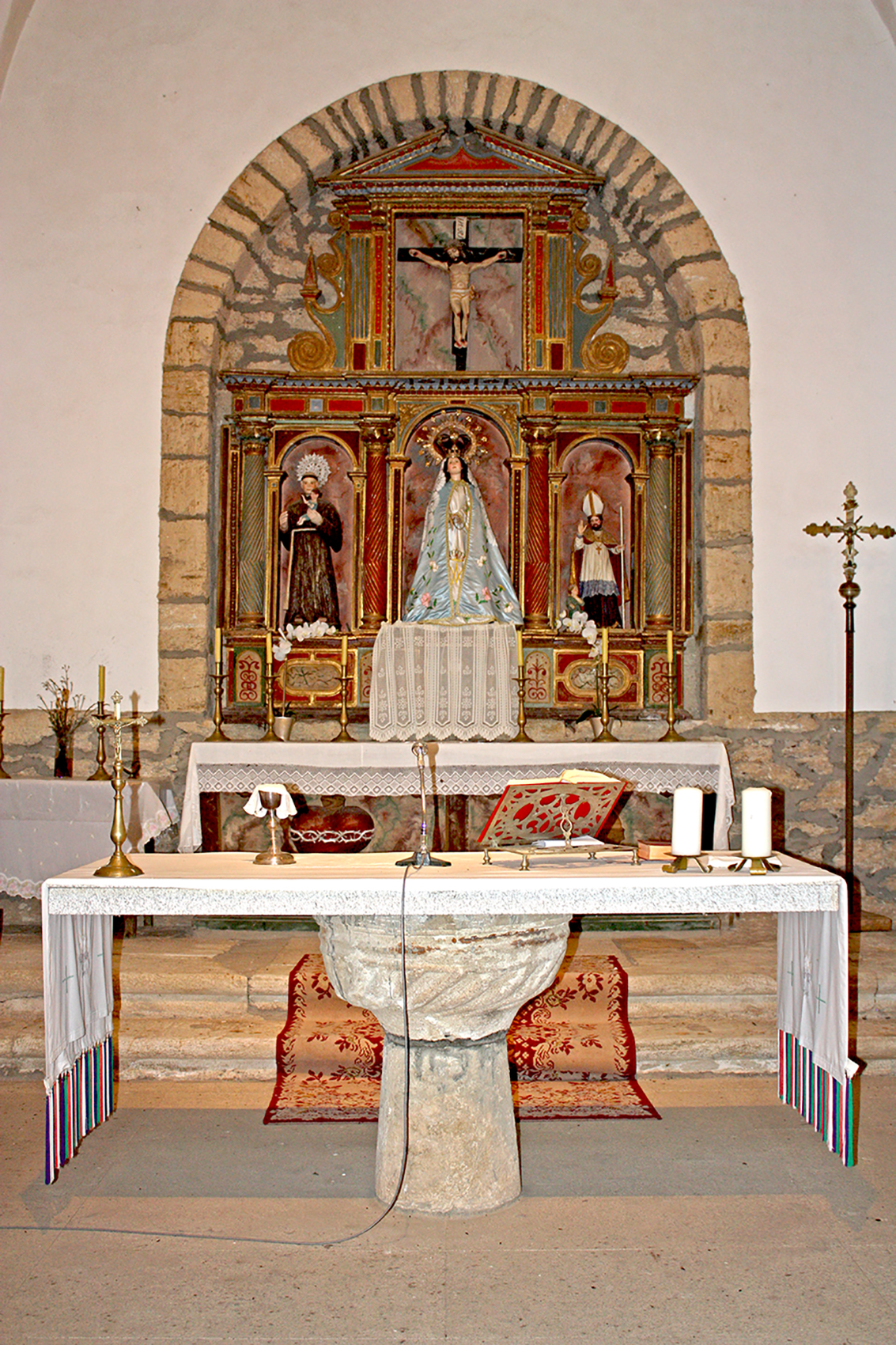 En la hornacina central se encuentra la imagen de vestir de la Virgen, flanqueada por San Antonio y San Blas a derecha e izquierda, no siendo ninguna de ellas coetáneas a la fábrica del retablo. En el ático se ubica a Cristo Crucificado. Ante el retablo mayor se ha colocado una mesa de altar que se eleva sobre la base de una antigua pila bautismal de cuenco semiesférico adornado con una faja de estrías oblicuas molduradas.