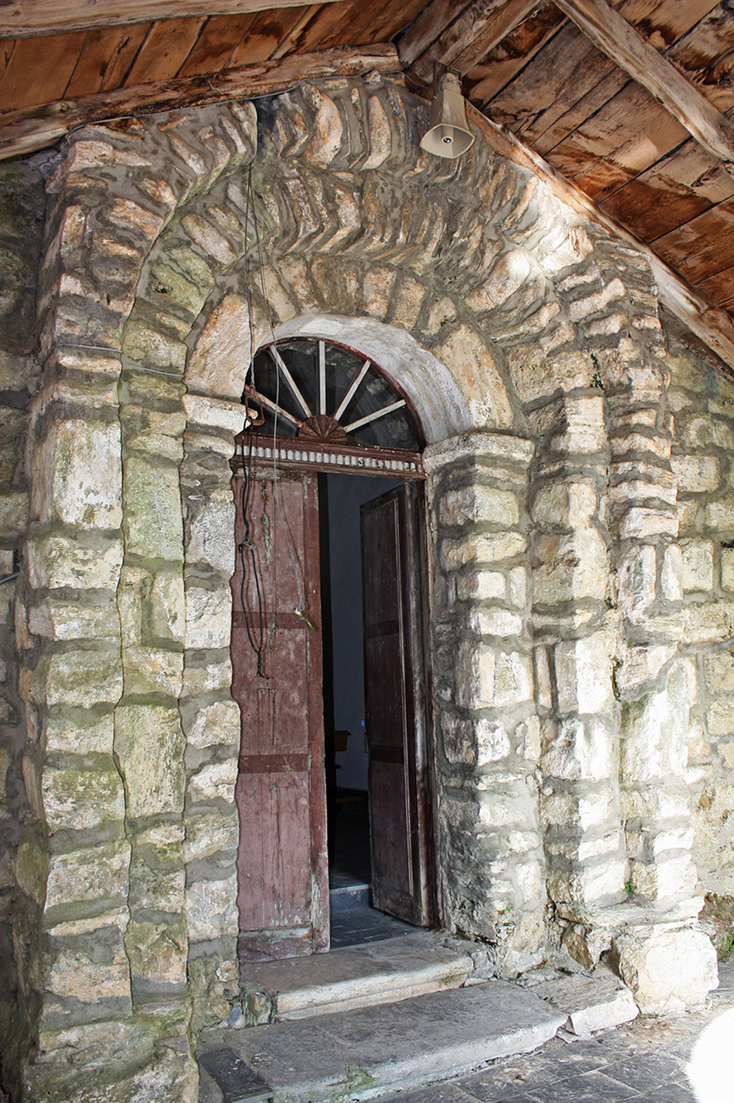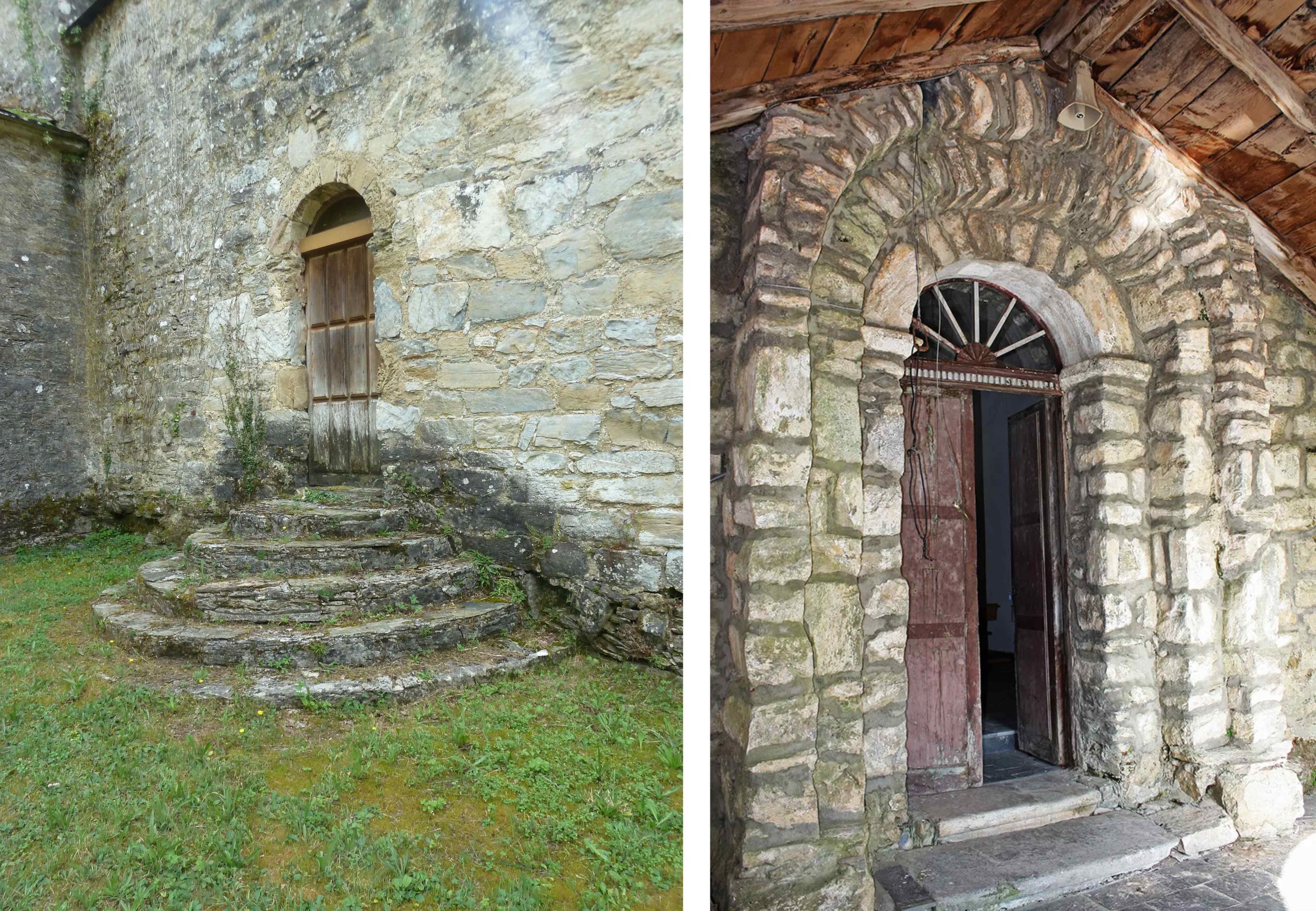 | Acceso secundario a la nave en el muro norte (izquierda) y acceso principal desde la fachada oeste (derecha). |