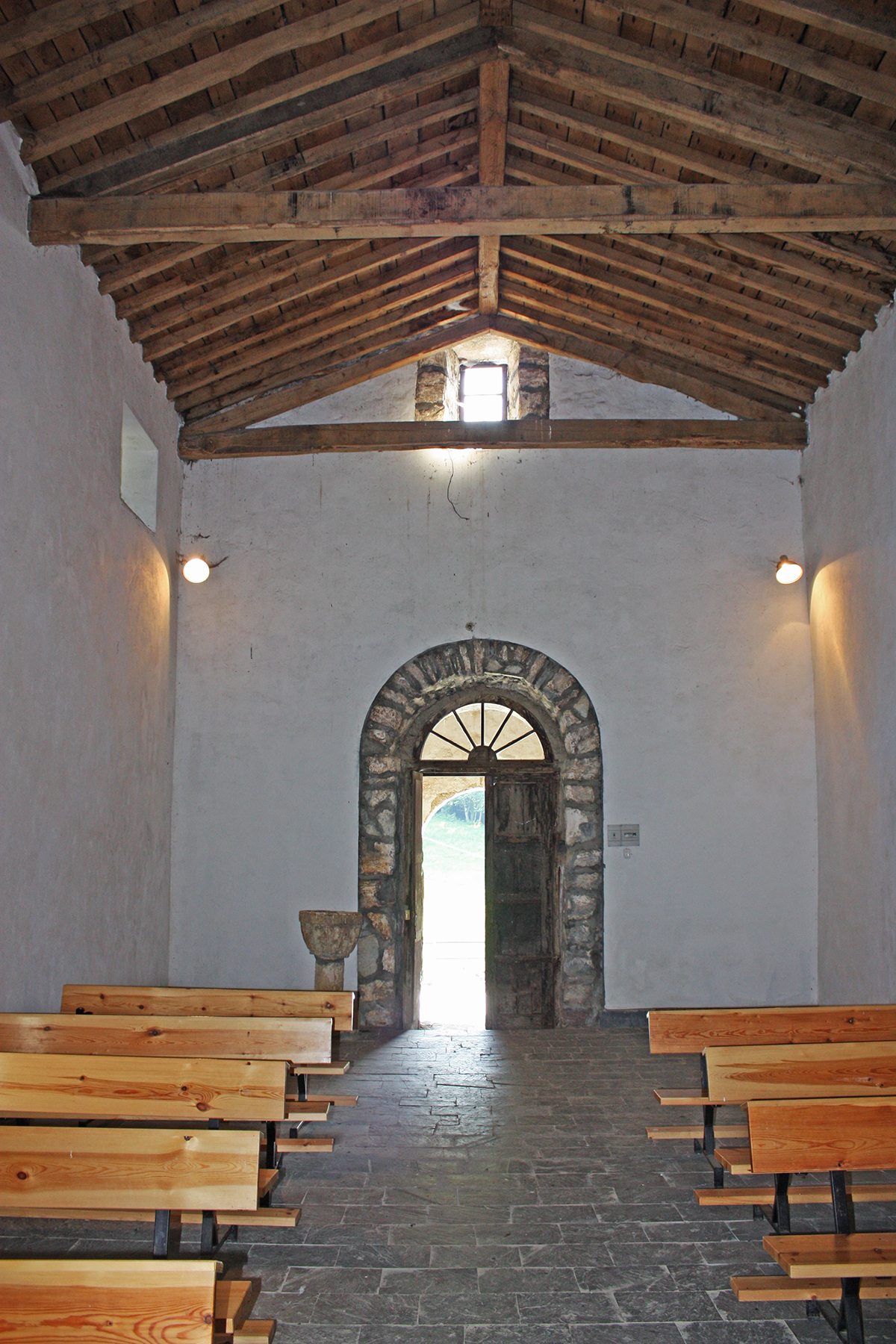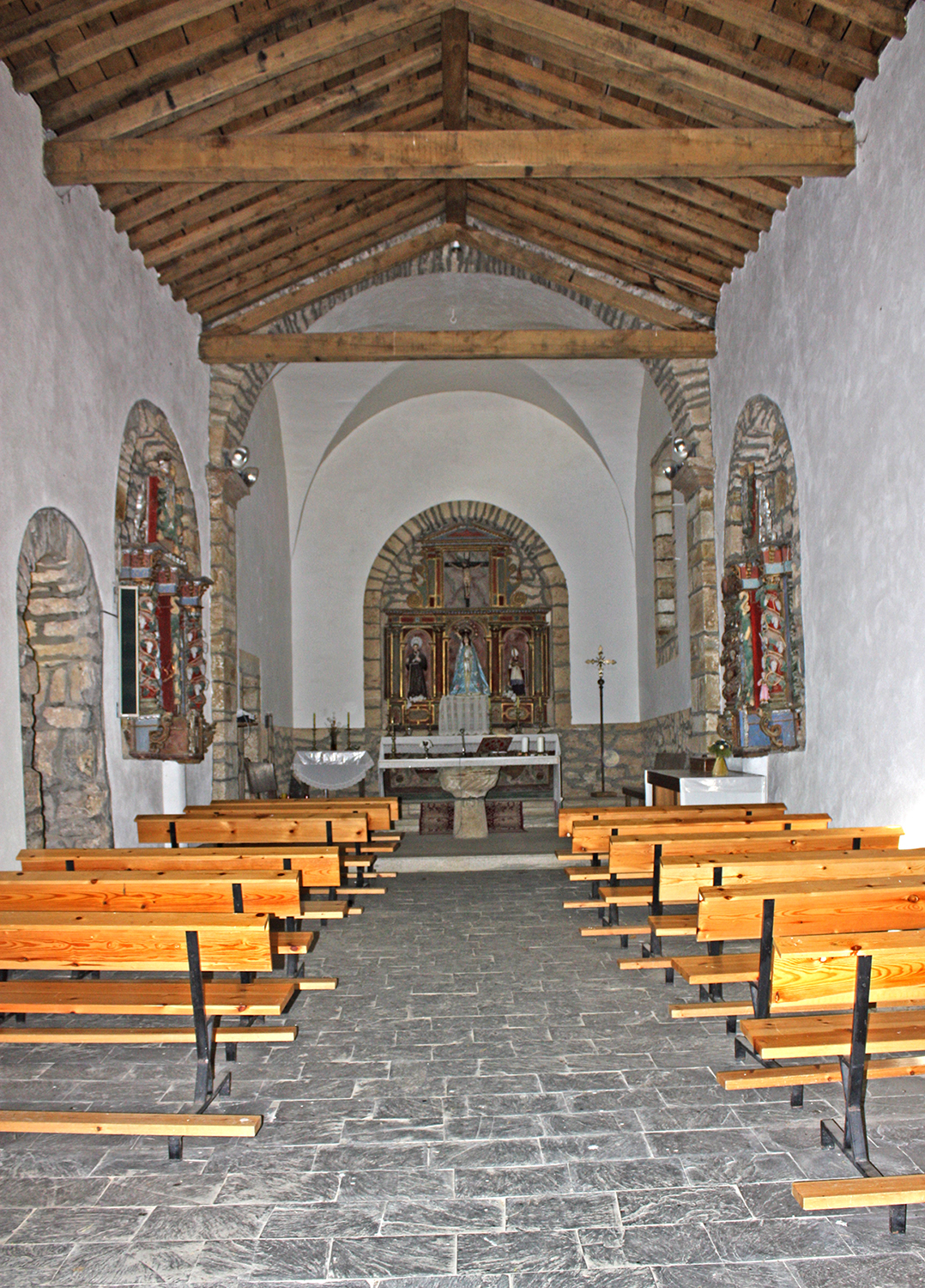 En el interior, los muros enlucidos de la nave dirigen la atención al presbiterio, que se eleva sobre la línea de cota del suelo de la nave. Este está enmarcado por un arco de medio punto y amplia luz que descarga sobre pilastras adosadas al muro. Tanto el arco como los idénticos de medio punto que se abren en ambos muros precediendo al presbiterio, así como los vanos (de iluminación y acceso), son los únicos elementos en los que se mantiene la piedra vista. Mientras la nave sigue la forma de la estructura de la cubierta con entramado de madera y vigas tirantes del mismo material que dan forma al armazón, el ábside se cubre con bóveda de arista.