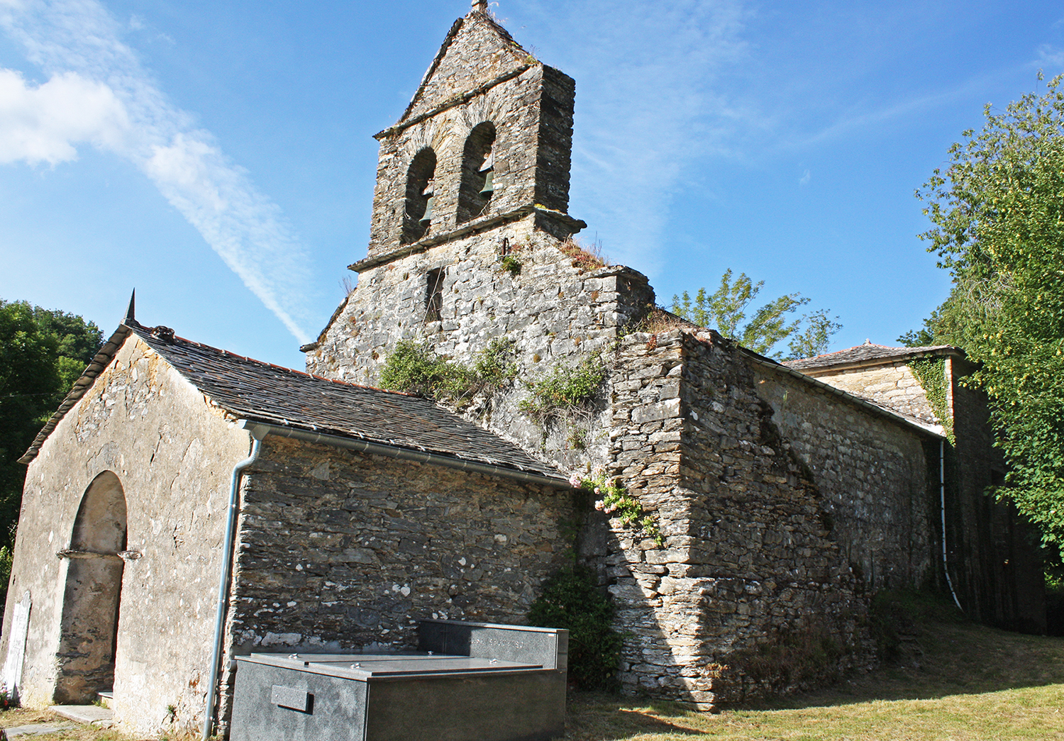Los muros laterales apenas se ven alterados, salvo en el lado norte por el acceso secundario al templo, precedido de una escalinata semicircular y en forma de arco de medio punto. En el muro sur, por el acceso exterior a la torre de campanario, que se conforma a través de un cuerpo de escalinata cerrado construido en piedra; además, a la altura del ábside se abre un vano abocinado que ilumina el interior. Todos los volúmenes que conforman el conjunto del edificio se cierran con pizarra, siguiendo la forma a dos aguas en el pórtico y la nave, a cuatro aguas en el ábside y a tres aguas en la sacristía.