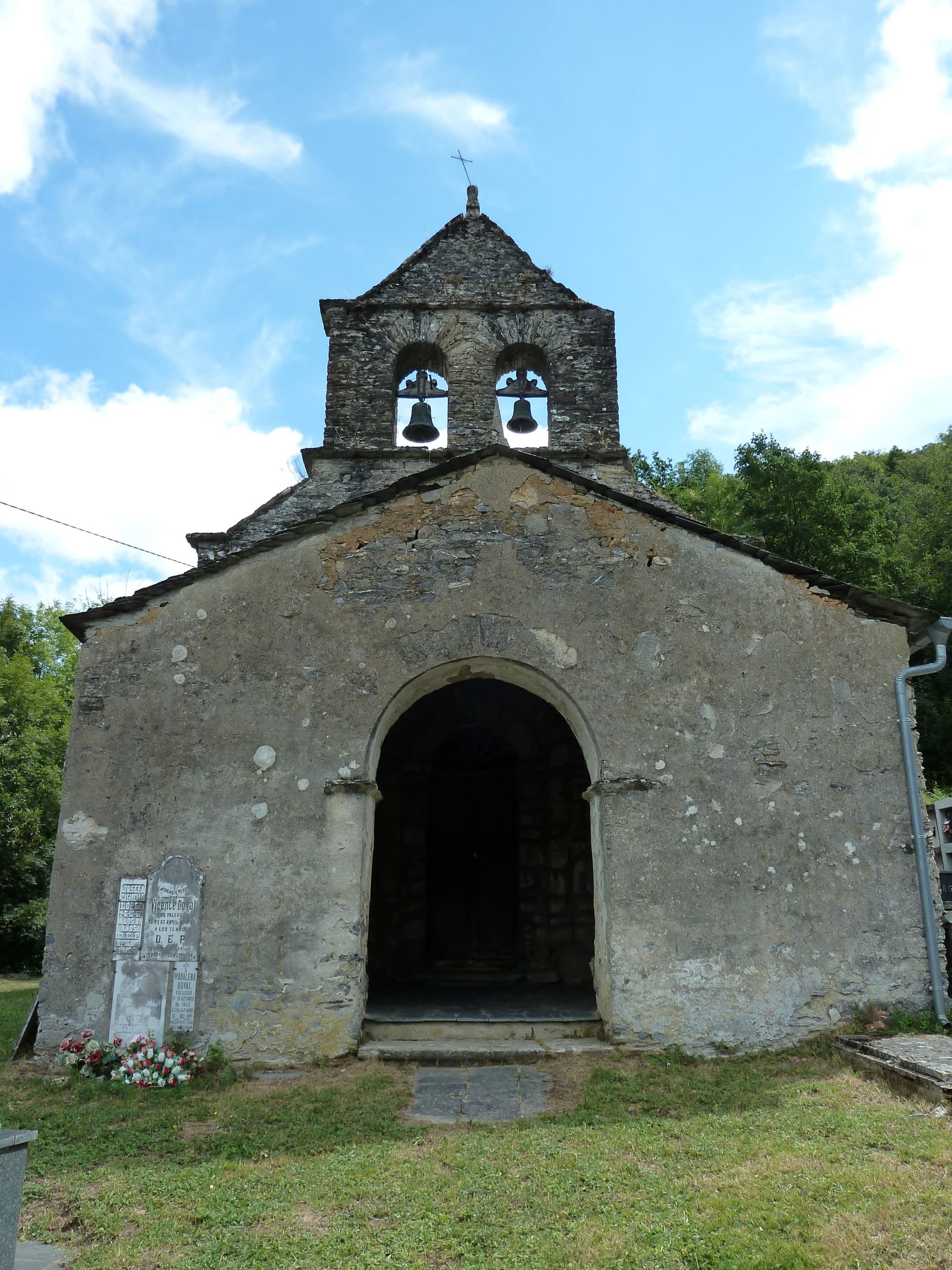 La fachada principal de la iglesia se presenta en un lienzo único con una marcada y rústica portada románica que consta de un arco de medio punto que descarga sobre imposta y que sobresalen ligeramente de las jambas y está rodeado por dos vueltas más de arco liberadas de cualquier ornamento pero que adelantan ligeramente el cuerpo de la portada con respecto a la línea de fachada conjugando la sencillez aplicada a la fábrica y al diseño de la portada con el movimiento arquitectónico que produce esta disposición.