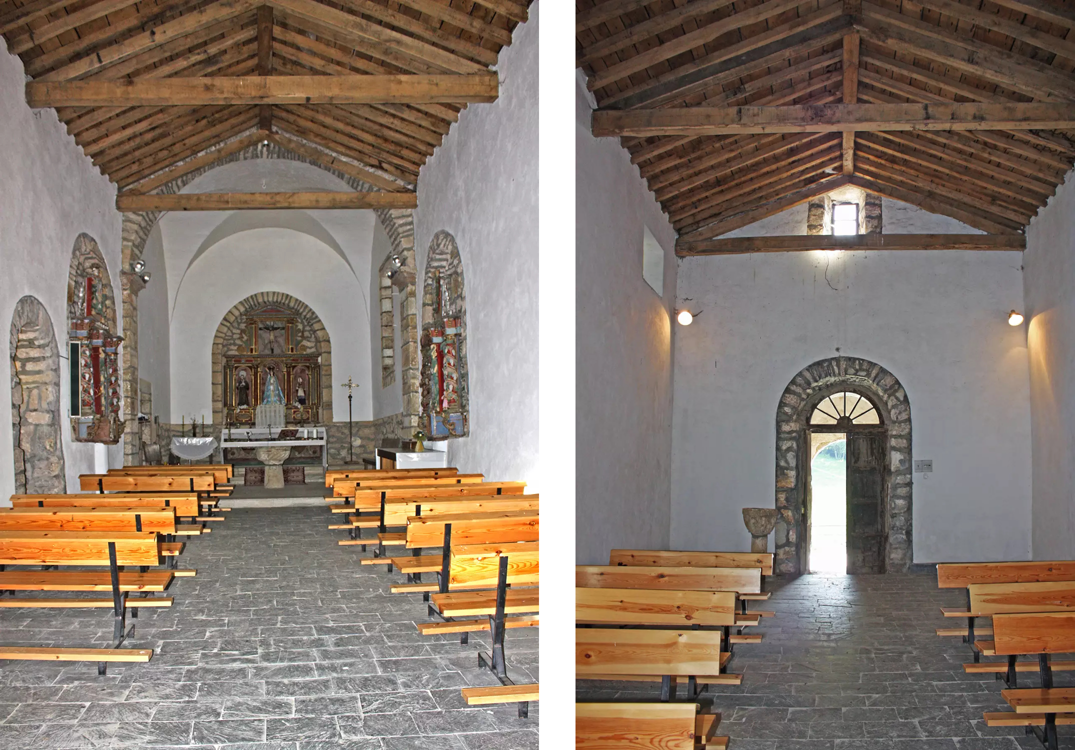 | Interior de la iglesia: nave y cabecera (izquierda) y pies de la iglesia (derecha). |