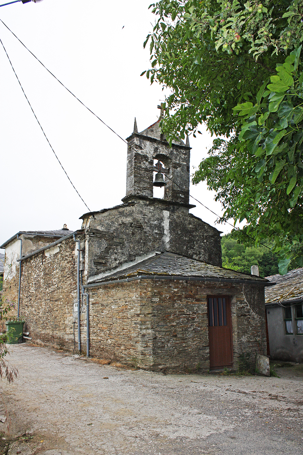 La iglesia consta de dos cuerpos de desigual altura, correspondientes a la nave y a la cabecera, que alberga en su interior el presbiterio; al lado derecho de la cabecera se adosa la sacristía y ante la entrada principal se levanta un pequeño pórtico cerrado por todos sus lados, que tiene en s interior un banco corrido. Los muros de toda la edificación están construidos con mampuestos enlucidos de sillarejos de esquisto trabados con mortero de barro. Las cubiertas son de pizarra sostenidas por armaduras de madera, que en el caso de la nave se ve reforzada con tres vigas tirantes.